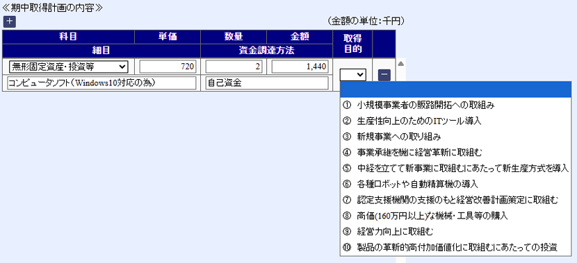 《期中取得計画の内容》で登録する細目欄の”取得目的”は補助金受給の主たる要件となっている場合が多いので、忘れないで入力してください。