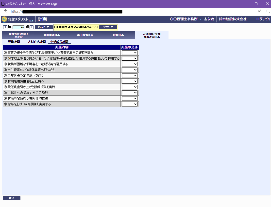 実施の是非を設定することで助成金の受給可能性を調べる事ができます。